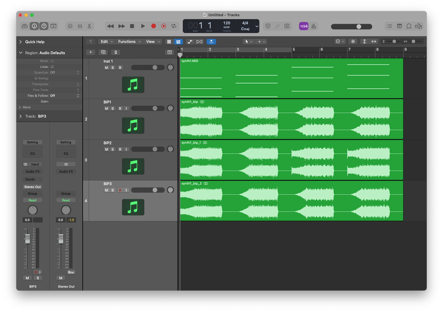Below you can see the MIDI region and the result of three separate ‘bounce in place’ operations. You can see from the start of each chord’s waveform that sometimes the attack time is being ignored, but it’s different for each bounce.